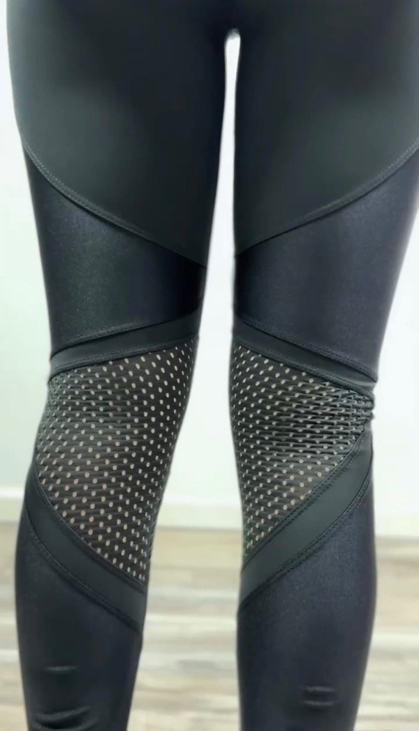 Legging largo en negro con efecto satinado. Detalles cruzados en la zona de rodillas con paneles de malla perforada para ventilación. Cintura alta elástica, tela suave y compresiva. Ideal para entrenamiento intenso o uso diario.